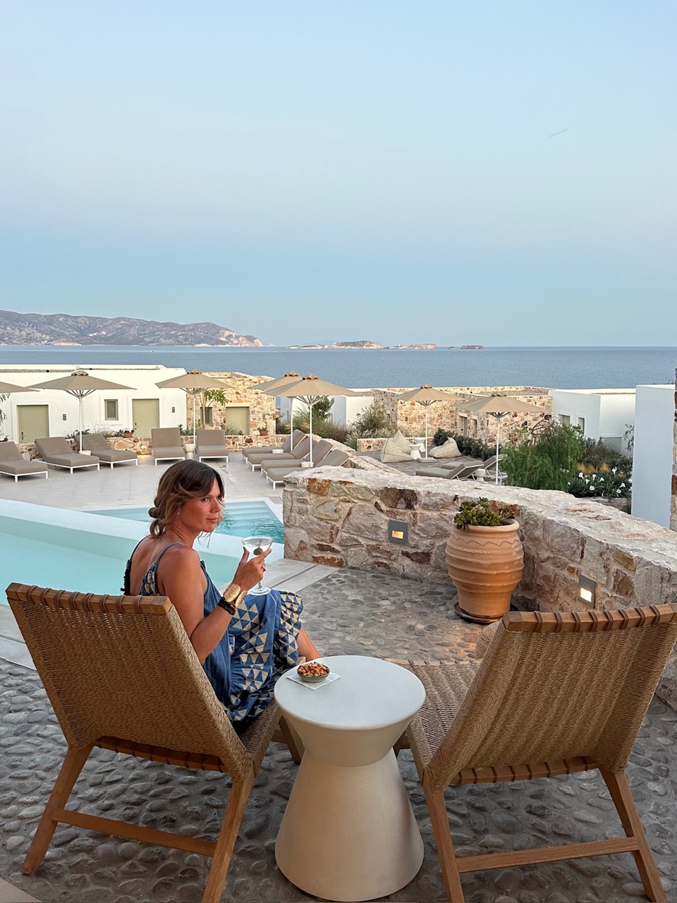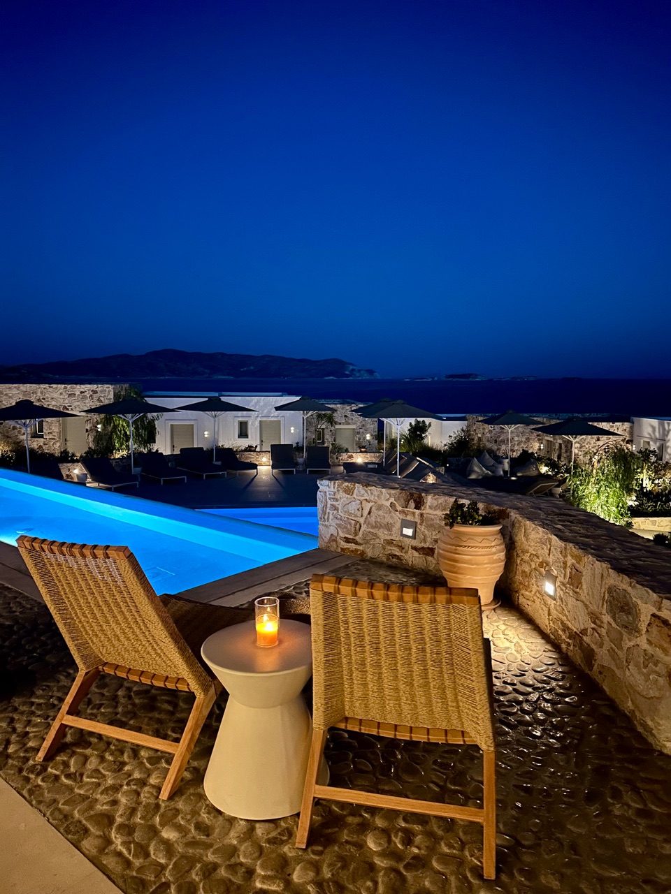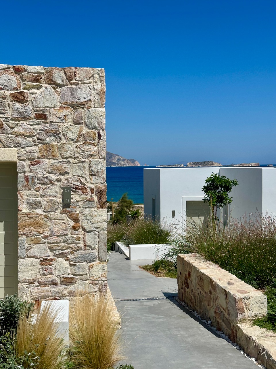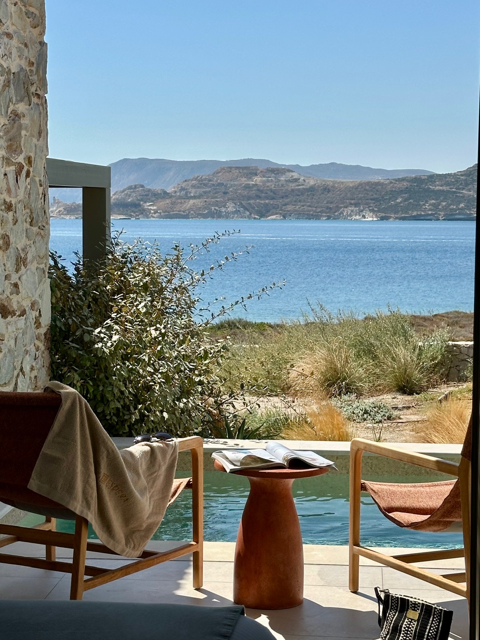 Ήταν τέλος Αυγούστου, οπότε είχα την ευκαιρία να μείνω σε μια από τις τρεις σουίτες με ιδιωτική πισίνα και θέα την Ανατολή (τα δωμάτια έχουν θέα είτε στην Ανατολή, είτε στη Δύση), με την άνυδρη Πολύαιγο -το ακατοίκητο νησί, με τις παρθένες παραλίες- να κυριαρχεί στο κάδρο μου. Ευρύχωρη και πλημμυρισμένη φως, αυτή η minimal αισθητικής σουίτα τα είχε όλα προσεκτικά επιλεγμένα: υφές, υλικά, φωτισμοί, amenities. Μια πολυτέλεια που δεν φωνάζει, υπάρχει σιωπηλά, με τέτοιο τρόπο ώστε να μην σου λείψει τίποτα. Όλα όσα χρειάζεσαι, χωρίς τίποτα περιττό!