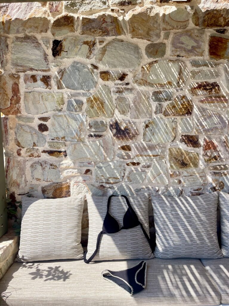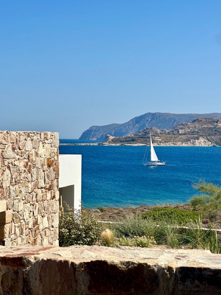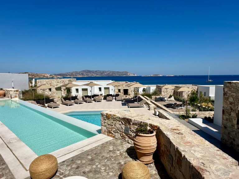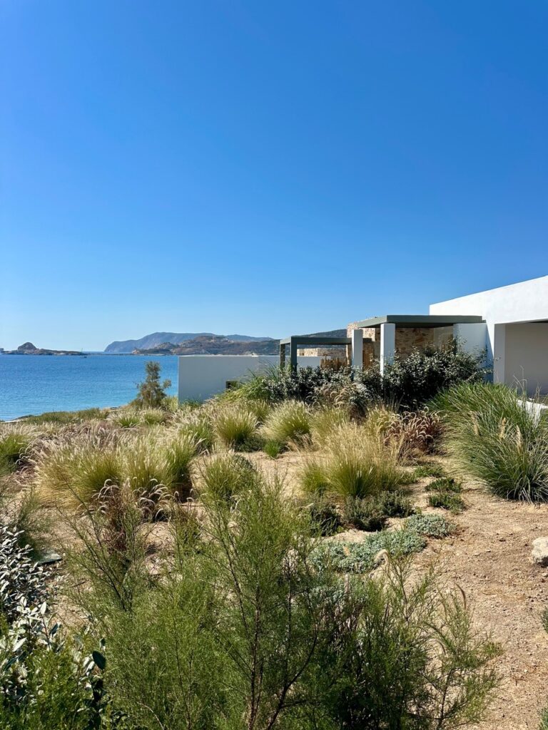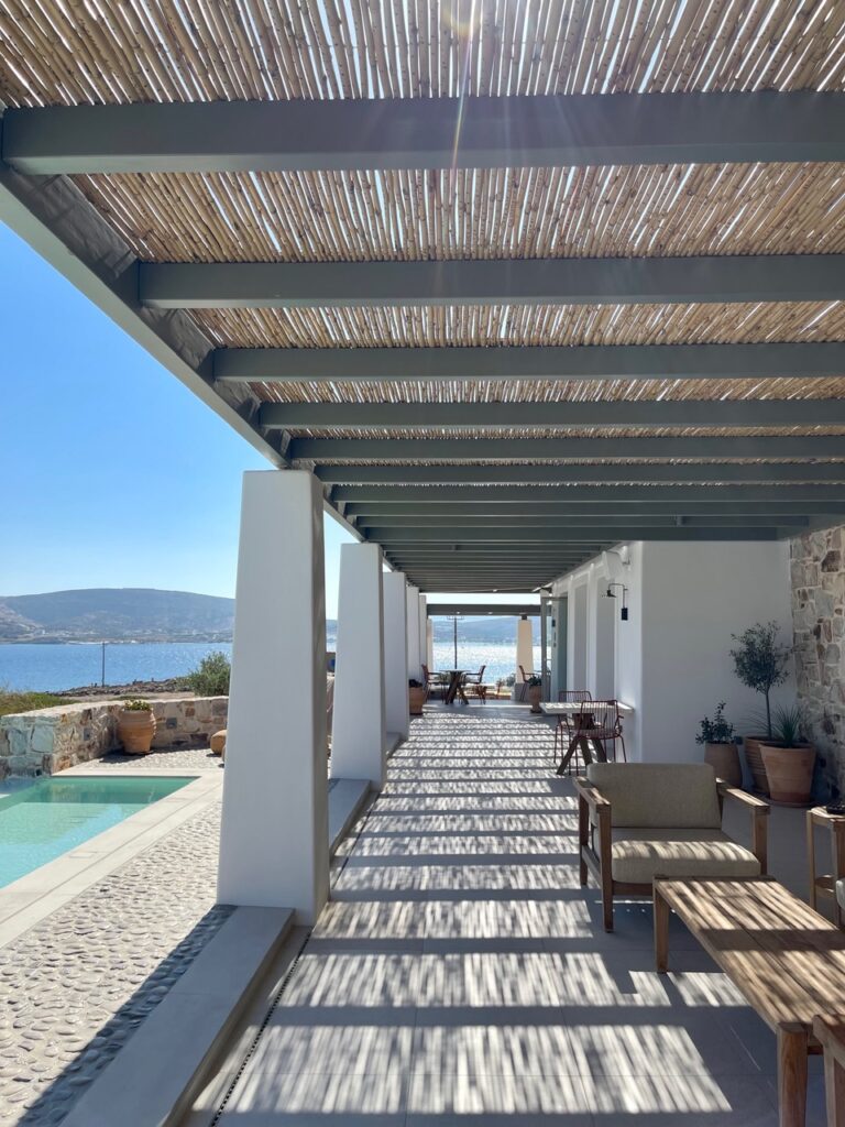 Ήταν τέλος Αυγούστου, οπότε είχα την ευκαιρία να μείνω σε μια από τις τρεις σουίτες με ιδιωτική πισίνα και θέα την Ανατολή (τα δωμάτια έχουν θέα είτε στην Ανατολή, είτε στη Δύση), με την άνυδρη Πολύαιγο -το ακατοίκητο νησί, με τις παρθένες παραλίες- να κυριαρχεί στο κάδρο μου. Ευρύχωρη και πλημμυρισμένη φως, αυτή η minimal αισθητικής σουίτα τα είχε όλα προσεκτικά επιλεγμένα: υφές, υλικά, φωτισμοί, amenities. Μια πολυτέλεια που δεν φωνάζει, υπάρχει σιωπηλά, με τέτοιο τρόπο ώστε να μην σου λείψει τίποτα. Όλα όσα χρειάζεσαι, χωρίς τίποτα περιττό!