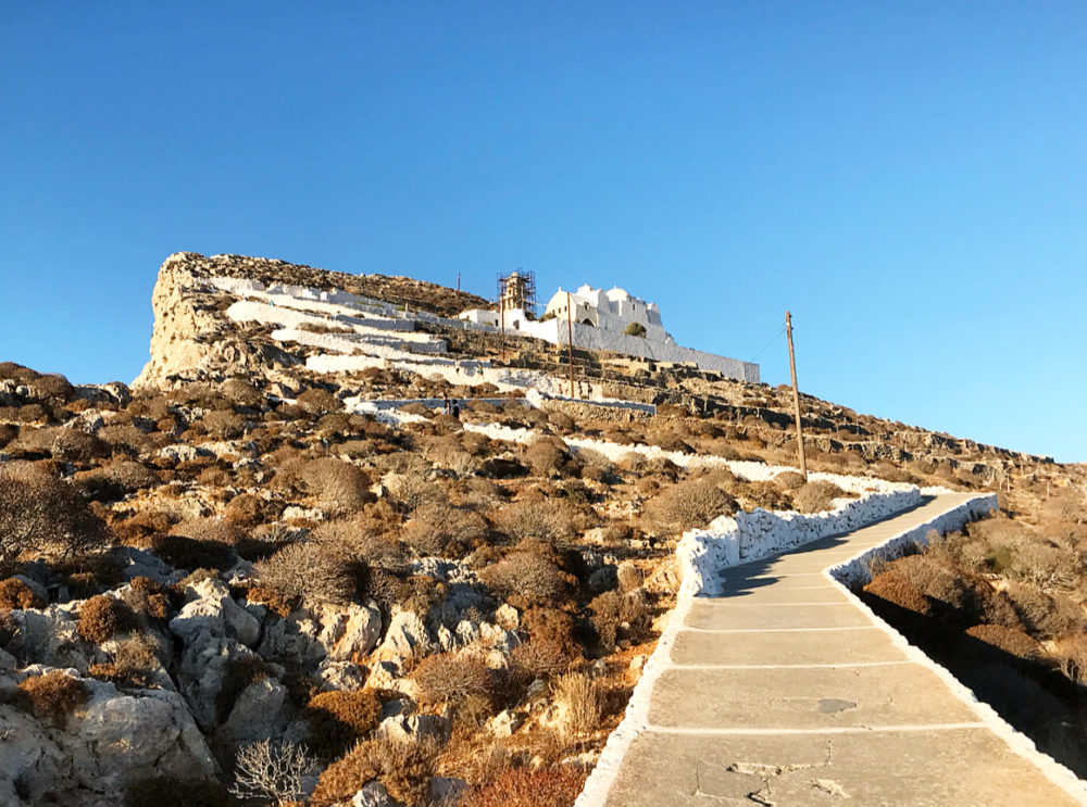 •Το Ηλιοβασίλεμα όλοι οι δρόμοι οδηγούν στη Παναγιά! Αξίζει να ακολουθήσετε το ανηφορικό φιδωτό μονοπάτι (15’) για να φτάσετε στην κορυφή! Σε κάθε στροφή γυρίστε το κεφάλι σας και αγναντέψτε το λευκό της Χώρας να απομακρύνεται όλο και περισσότερο… Από εκεί ψηλά η θέα κόβει την ανάσα!