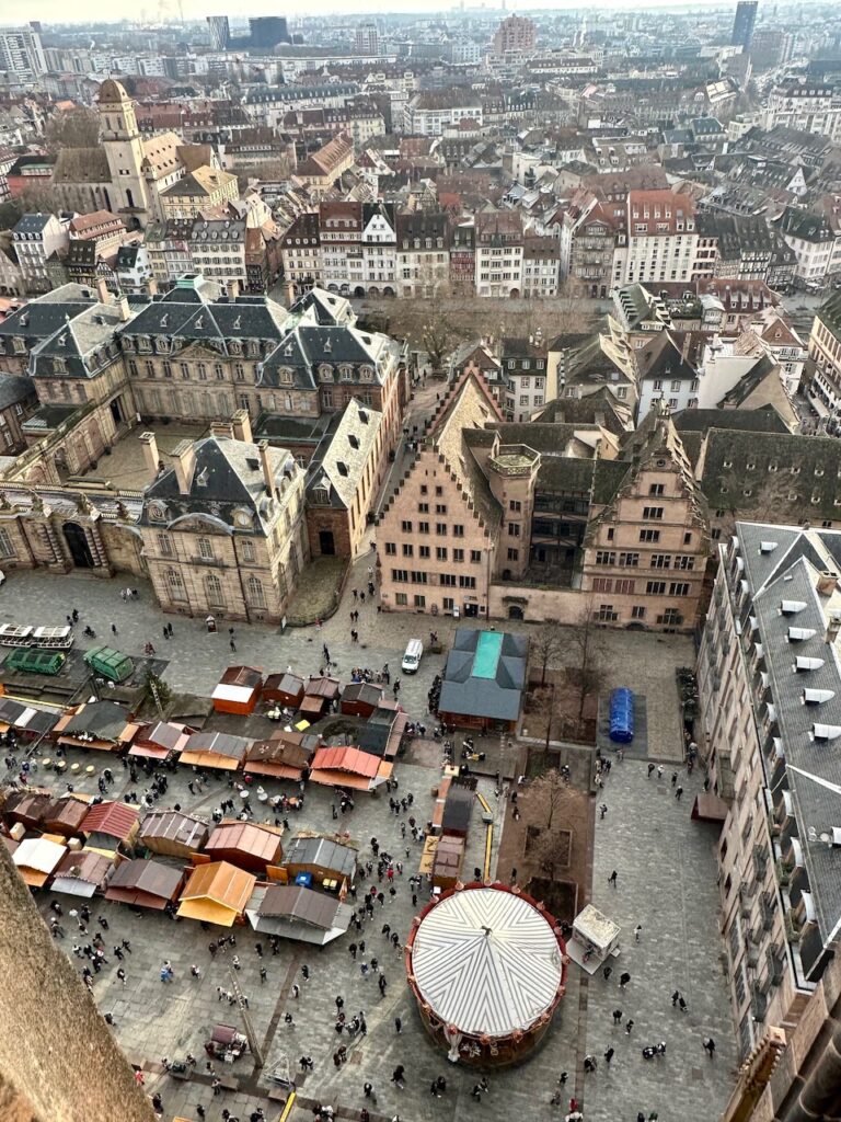 Η πλατεία του Καθεδρικού Ναού είναι γνωστή και για έναν άλλο λόγο. Για την παλαιότερη Χριστουγεννιάτικη αγορά της Ευρώπης που χρονολογείται το 1570! Πάνω από 300 ξύλινοι πάγκοι με ό,τι μπορείτε να βάλετε στο νου. Χειροποίητα στολίδια και παραδοσιακά διακοσμητικά, πλεκτά κασκόλ, κεριά, αρωματικά έλαια, ενώ δεν λείπουν και οι πάγκοι με τρόφιμα όπως ζαχαρωτά, σοκολάτες, διάφορα τσάι, αλλά και τοπικά τυριά και αλλαντικά. Φυσικά εκεί όπου δημιουργούνται οι μεγαλύτερες ουρές είναι στους πάγκους με τις τοπικές λιχουδιές, όπως τα παραδοσιακά μπισκότα Bredele, το ψωμί με μπαχάρια (Pain d’ epices), καθώς και το Vin chaud που δεν είναι άλλο από ζεστό κόκκινο ή λευκό κρασί με μπαχαρικά. Μην ξαφνιαστείτε αν σας ζητήσουν 1€ για το ποτήρι. Θα το πάρετε πίσω μόλις το επιτρέψετε σε οποιονδήποτε πάγκο της αγοράς. Δύσκολο να αντισταθώ στο άρωμα του. Άλλωστε με το κρύο που είχε, ένα ζεστό ρόφημα, μαζί με κάστανα και μια γλυκιά κρέπα ήταν ότι καλύτερο για να με βάλει σε γιορτινό mood!