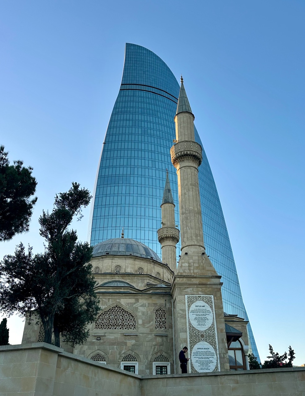 Σας υποσχέθηκα την καλύτερη θέα γι΄αυτό κι εσείς φροντίστε πριν τη Δύση του ηλίου να βρίσκεστε ήδη στην ουρά (γιατί θα συναντήσετε σίγουρα) για το τελεφερίκ Baku Funicular που συνδέει την Baku Boulevard με το ψηλότερο σημείο της πόλης, κοντά στο Upland Park (Dagustu Park) και το Μνημείο των Μαρτύρων. Οι τολμηροί βέβαια μπορείτε να φτάσετε μέχρι εκεί και με τα πόδια (μόλις 20΄) απλά σας προειδοποιώ ότι η διαδρομή είναι ανηφορική, με αρκετά σκαλοπάτια. Με το που βγείτε στον σταθμό ήδη θα νιώσετε ένα δέος καθώς η εικόνα από το Martyrs’ Mosque που καθρεφτίζεται πάνω σε έναν από τους τρεις εντυπωσιακούς γυάλινους ουρανοξύστες είναι η απόλυτη αντιφατική εικόνα παράδοσης και σύγχρονης αρχιτεκτονικής! Πρόκειται για τους Flame Towers, το παγκόσμιο σύμβολο της πόλης, δεν θα μπορούσε να αναπαριστά τις φλόγες. Ο ένας με πολυτελείς κατοικίες, ο άλλος με γραφεία, ενώ ο τρίτος φιλοξενεί το ξενοδοχείο Fairmont Baku.