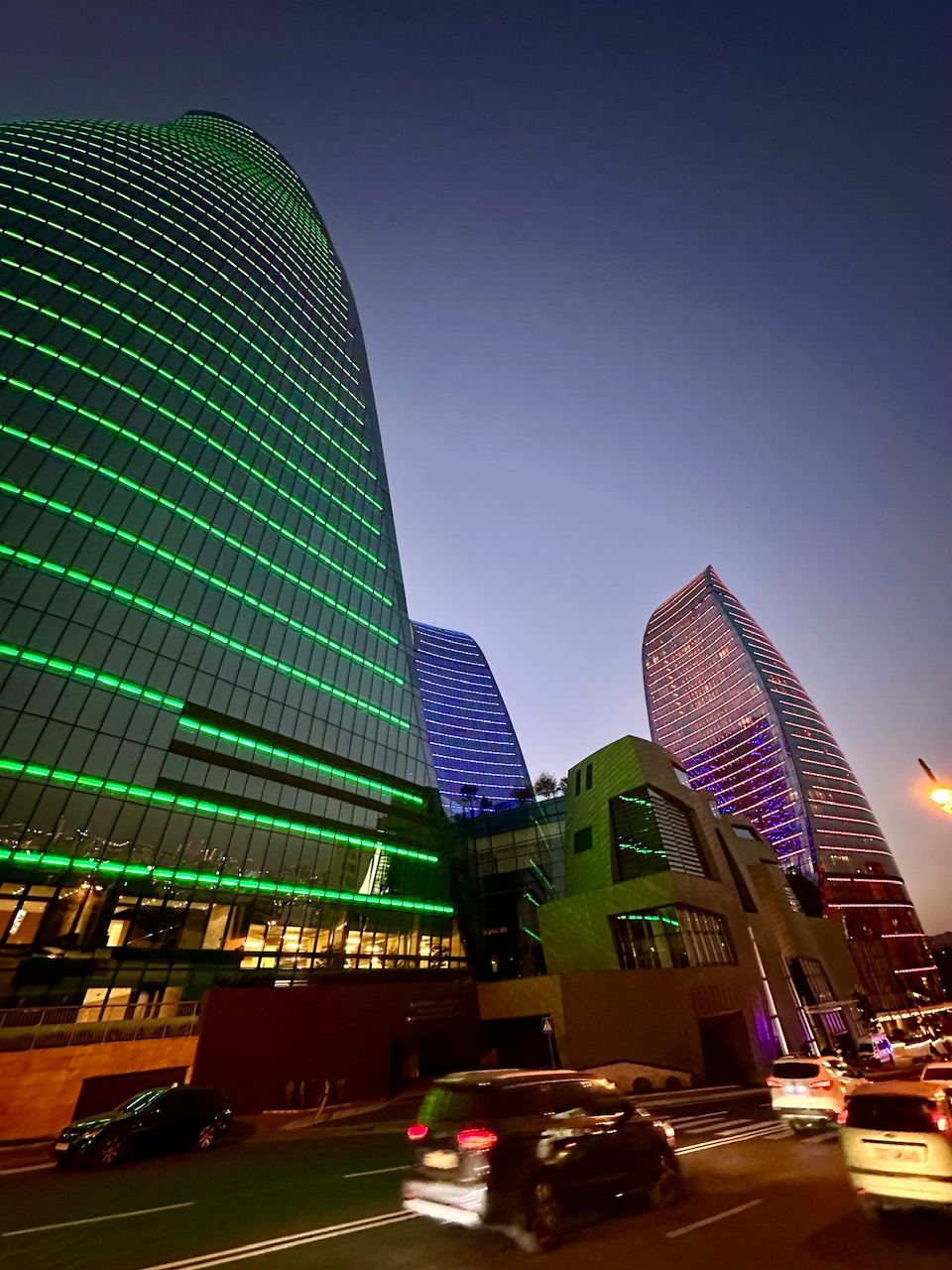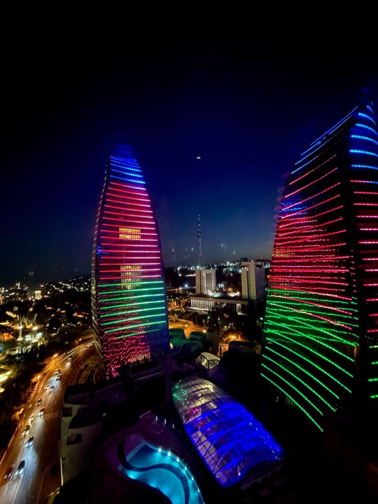 Ακολουθήστε το πλήθος για το πανοραμικό σημείο, καθώς εκεί σας επιφυλάσσει την καλύτερη θέα στην πόλη. Από ψηλά βλέπετε τα πάντα με το μάτι να χάνεται μακριά στον ορίζοντα… Ειδικά την ώρα που η Δύση βάφει τον ορίζοντα με τις πορφυρές αποχρώσεις της και τα φώτα της πόλης ανάβουν σταδιακά. Τότε, γύρω στις 19:00, είναι που ξεκινά και το light show των Flames Towers. Kαλυμμένοι με χιλιάδες Led φώτα, δημιουργούν εντυπωσιακές εναλλαγές χρωμάτων και animations, με μοτίβα όπως φλόγες που κινούνται πάνω στις όψεις των πύργων, ή θέματα όπως σιλουέτες ανθρώπων, ή τη σημαία του Αζερμπαϊτζάν…Το show διαρκεί όλο το βράδυ και είναι εντυπωσιακό να το δείτε τόσο από τον δρόμο, όσο και από το επόμενο σημείο που θα σας αποκαλύψω…