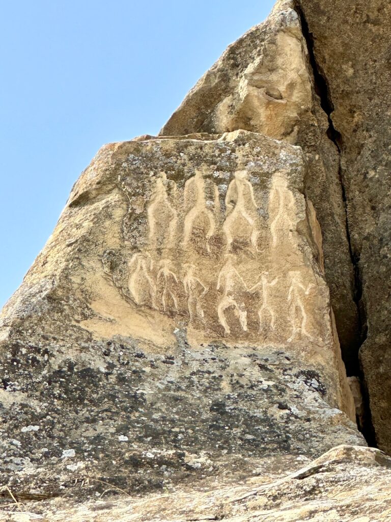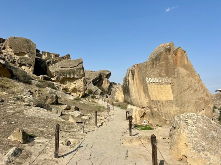 Ήταν από τις εκδρομές που μέχρι τελευταία στιγμή δεν ήμουν σίγουρη αν πρέπει να κάνω, αλλά τελικά άξιζε τον κόπο! Και εδώ θα σας προτείνω και τον καλύτερο τρόπο να την πραγματοποιήσετε για να μην χάσετε όλη σας την ημέρα, καθώς οι οργανωμένες εκδρομές ξεκινούν παραδοσιακά νωρίς το πρωί και επιστρέφουν το απόγευμα. Πρόκειται για ένα μοναδικό τοπίο, 40’ από την πόλη του Μπακού ακολουθώντας μια παραθαλάσσια διαδρομή. Το Gobustan είναι ένας από τους σημαντικότερους αρχαιολογικούς χώρους του Αζερμπαϊτζάν και γι΄ αυτό προστατεύεται από την Unesco. Μόλις φτάσετε επισκεφθείτε το μουσείο (10 AZN-5€) το οποίο διηγείται μέσω οπτικοακουστικού υλικού την ιστορία, αλλά και τη σημασία της περιοχής. Από εκεί σε λίγα λεπτά με το αυτοκίνητο φτάνετε σε ένα σχεδόν απόκοσμο τοπίο με περίφημους βραχώδεις σχηματισμούς όπου υπάρχουν πάνω από 6.000 προϊστορικές βραχογραφίες, ηλικίας άνω των 10.000 ετών! Οι βραχογραφίες απεικονίζουν σκηνές απά την καθημερινή ζωή, κυνηγετικές δραστηριότητες, ζώα και τελετουργίες προσφέροντας μια σπάνια ματιά στον αρχείο πολιτισμό της περιοχής! Ο επισκέψιμος υπαίθριος χώρος δεν εκτείνεται σε μεγάλη απόσταση, κάτι που σας επιτρέπει να τον περπατήσετε άνετα.