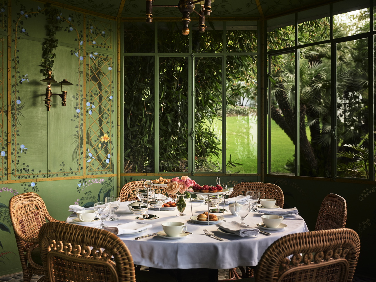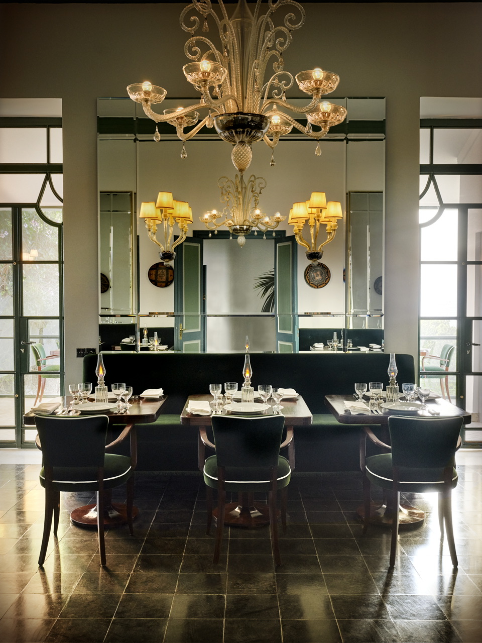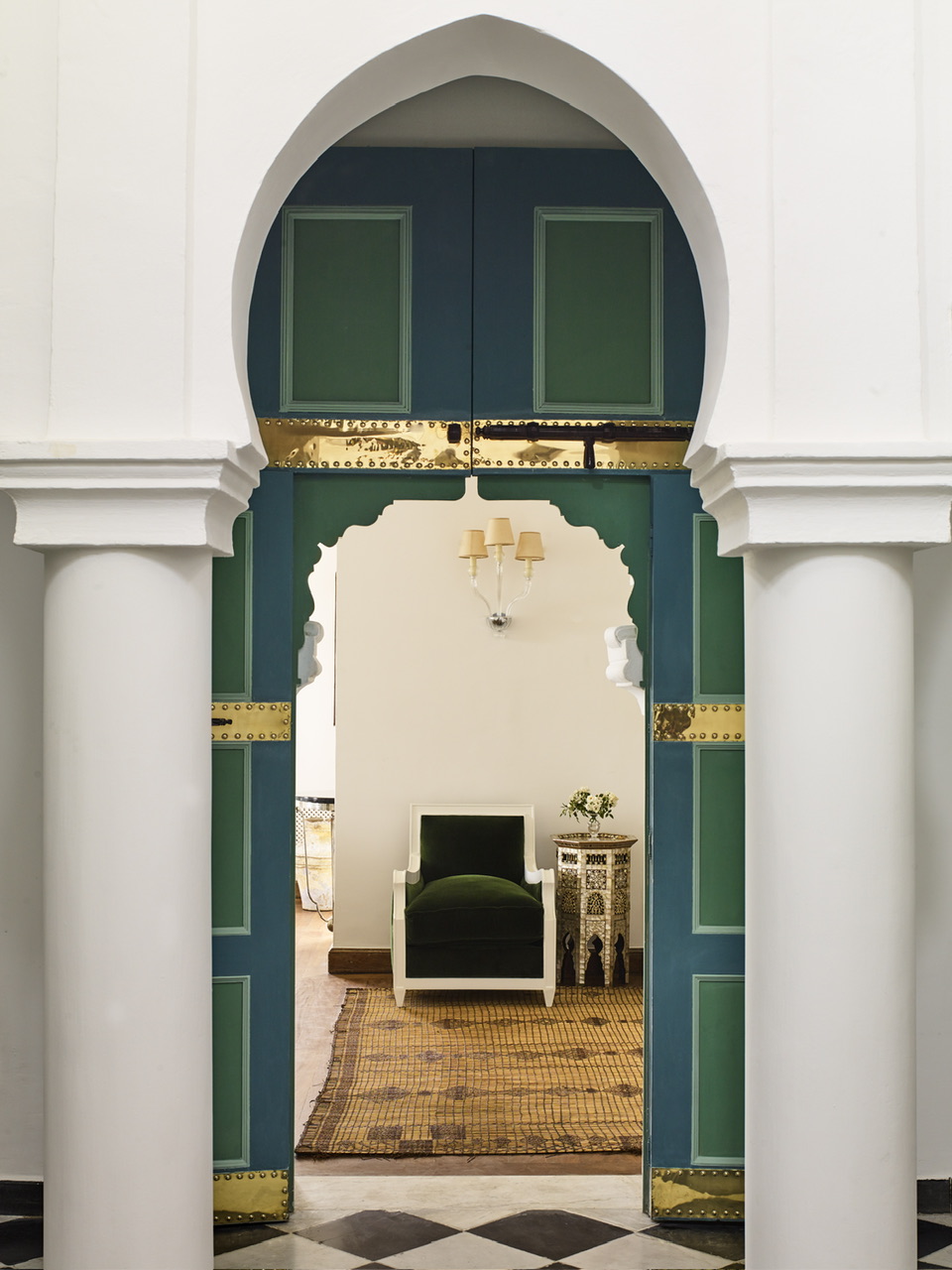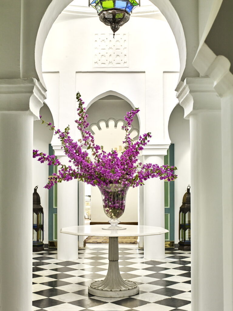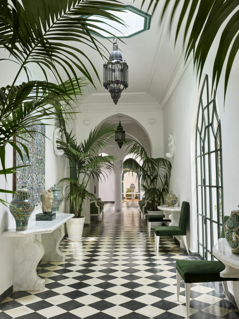 Το φως εισχωρεί από τις μεγάλες γυάλινες πόρτες, λούζοντας κάθε δωμάτιο με την αίσθηση του εξωτερικού χώρου. Κάθε σουίτα είναι ξεχωριστή, σχεδιασμένη με γνώμονα την άνεση και την ηρεμία. Ο Jasper Conran συνδυάζει μοντέρνες γραμμές με παραδοσιακά υλικά, δημιουργώντας έναν διάλογο ανάμεσα στο παλιό και το νέο. Συγκεκριμένα, η διακόσμηση περιλαμβάνει μαρμάρινα δάπεδα, Murano πολυελαίους, κουρτίνες voile, έπιπλα από ρατάν, καθρέφτες και τραπεζάκια με ένθετα από φίλντισι, μαυριτανικά δερμάτινα και ψάθινα χαλιά, λεπτομέρειες από τοπικά πλακάκια Bejmet και Zellige. Οι αποχρώσεις του πράσινου, μπλε, καραμέλας και τσαγιού συνδυάζονται με vintage κεντήματα Fez, αρχαία ρωμαίκά μωσαϊκά και πλακάκια Ανδαλουσίας του 16ου αιώνα, δημιουργώντας έναν χώρο γεμάτο χαρακτήρα και κομψότητα.