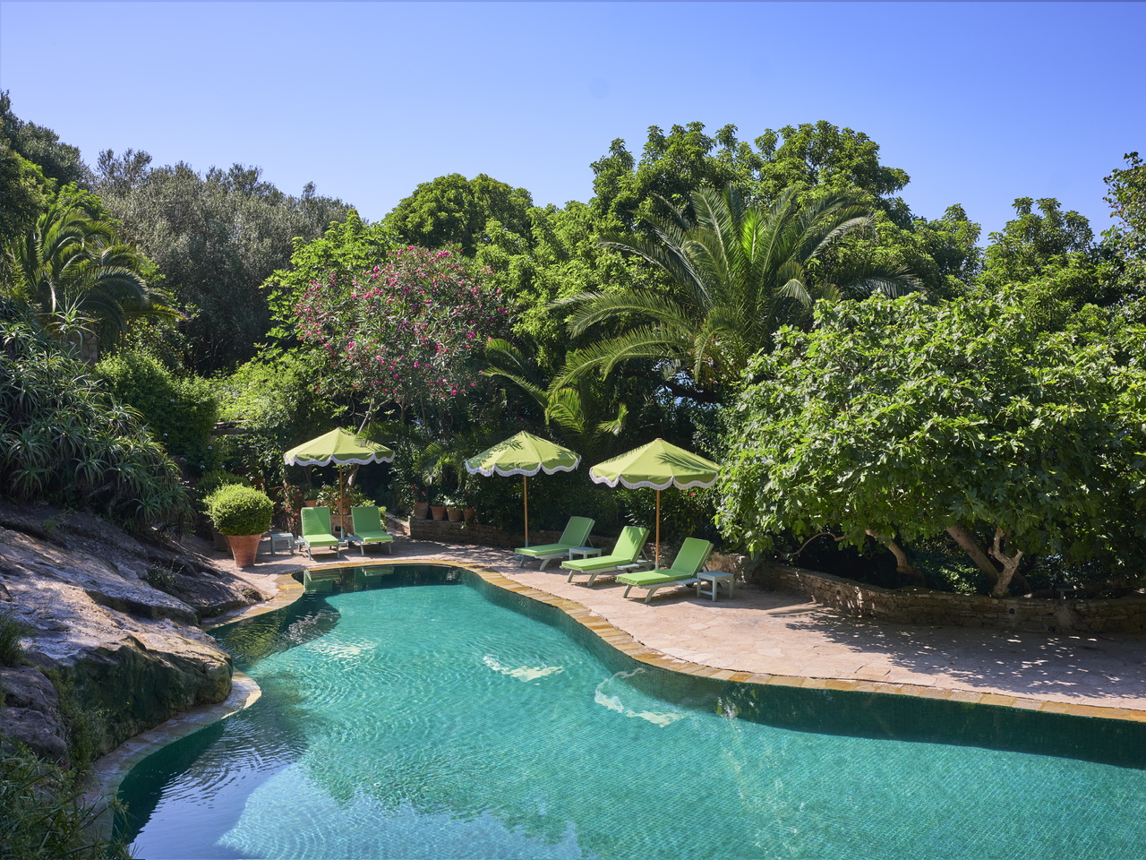 Η Villa Mabrouka διαθέτει δύο πισίνες για αποκλειστική χρήση των ενοίκων:μια μεγαλύτερη, σκαλισμένη στους βράχους και μια μικρότερη που αστράφτει με σμαραγδένια τοπικά πλακάκια σε μοτίβο ψαροκόκαλο.